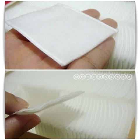化妝棉表層細緻度、柔軟度均在中等以上,不會扎臉,兩側的車邊也不會尖得刺手